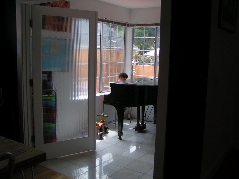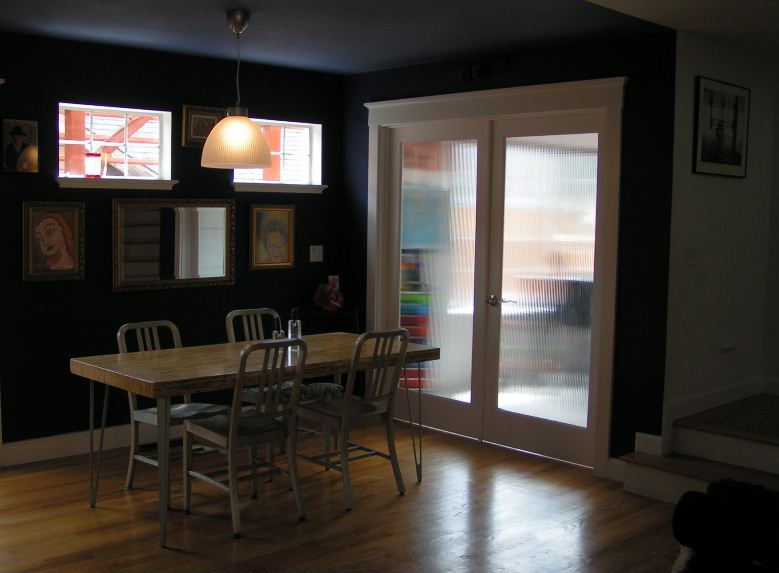 office can be closed off using these extra large french doors with reeded glass panes