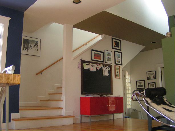 this is the view from the dining area toward the entry and stairs