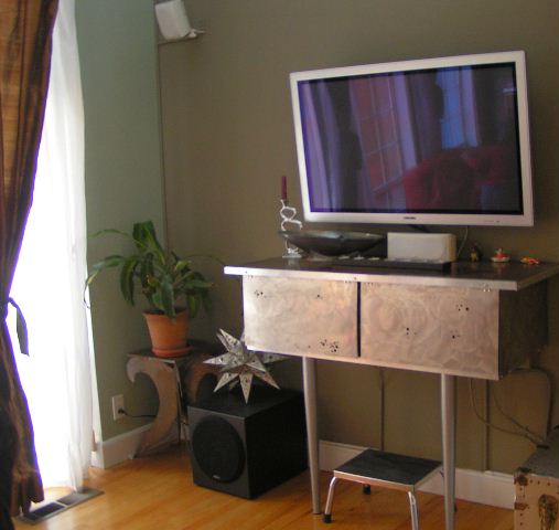 hitachi high definition 42 inch plasma screen with all equipment in a built in stainless steel cabinet. cabinet is vented and has holes arranged to correspond with infra red eye to allow use of remote control for the sattelite receiver, 200 cd changer, DVD player etc. head unit is a denon with very low thd, high wattage output, can also play two sources at the same time (kids watch dvd inside, I listen to something else via outdoor speakers). indoor speakers are polk audio.