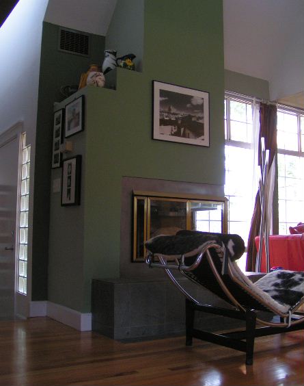 wrap around wood burning fireplace with slate mantle
